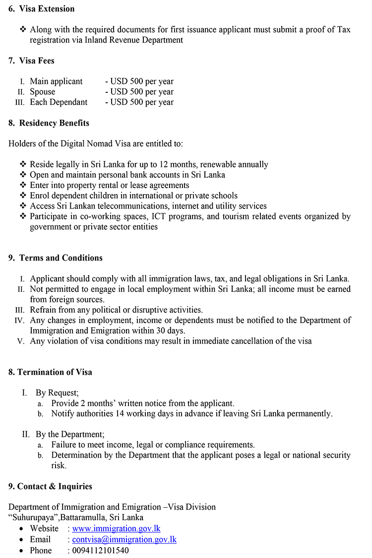 මෙම Digital Nomad Visa කාණ්ඩය පිළිබඳ වැඩිදුර තොරතුරු සහ අයදුම්පත්, ආගමන හා විගමන දෙපාර්තමේන්තුවේ නිල වෙබ් අඩවිය වන www.immigration.gov.lk